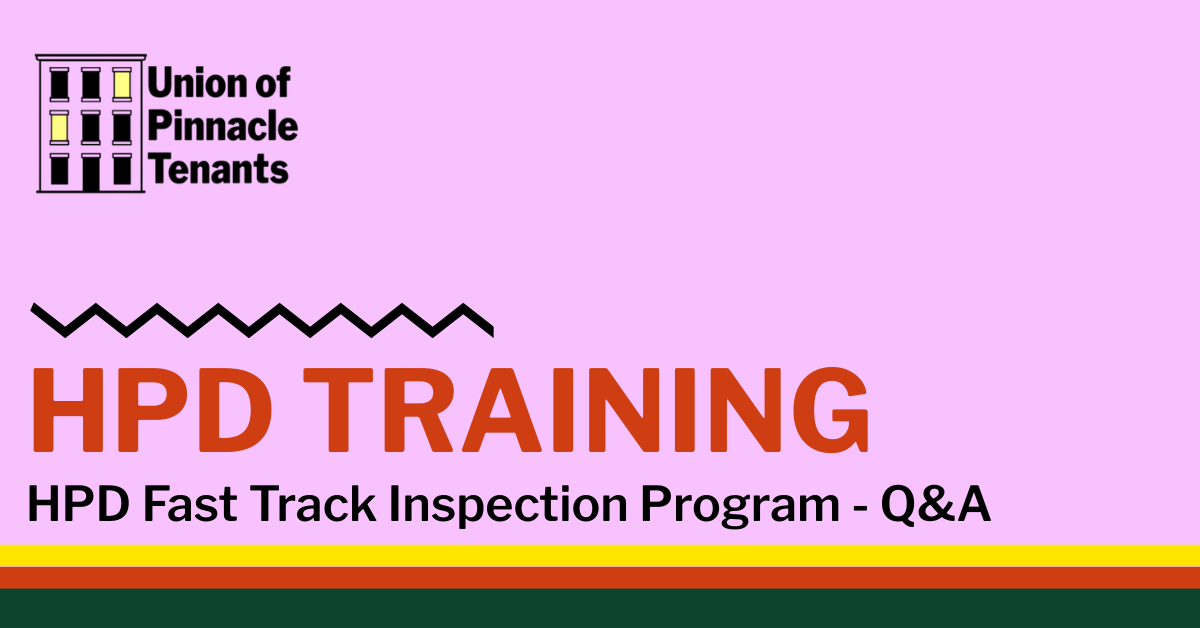 We were able to work with HPD and JustFix to create a Fast Track Inspection program. Come to this meeting to learn more about how to schedule building-wide HPD inspections for your building.